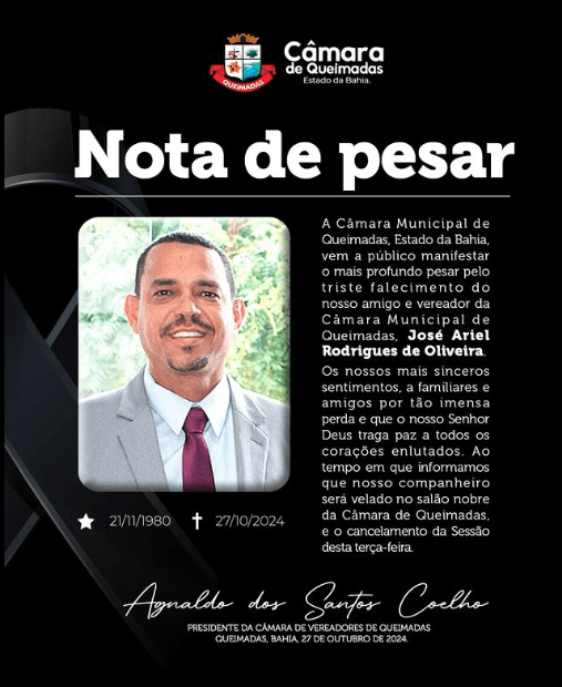 A Câmara Municipal de Vereadores de Queimadas, Estado da Bahia, vem a público manifestar o mais profundo pesar pelo triste falecimento do nosso amigo e vereador da Câmara Municipal de Queimadas-BA, o sr. José Ariel Rodrigues de Oliveira. Os nossos mais sinceros sentimentos a familiares e amigos por tão imensa perda e que o nosso Deus traga paz aos corações enlutados. Ao tempo em que informamos que nosso companheiro será velado no salão nobre da Câmara de Queimadas, e o cancelamento da Sessão Ordinária desta terça-feira.