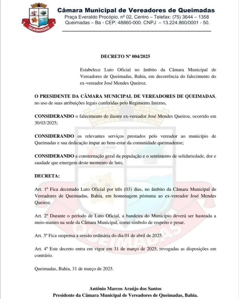 Art. 1° Fica decretado Luto Oficial por três (03) dias, no âmbito da Câmara Municipal de Vereadores de Queimadas, Bahia, em homenagem póstuma ao ex-vereador José Mendes
